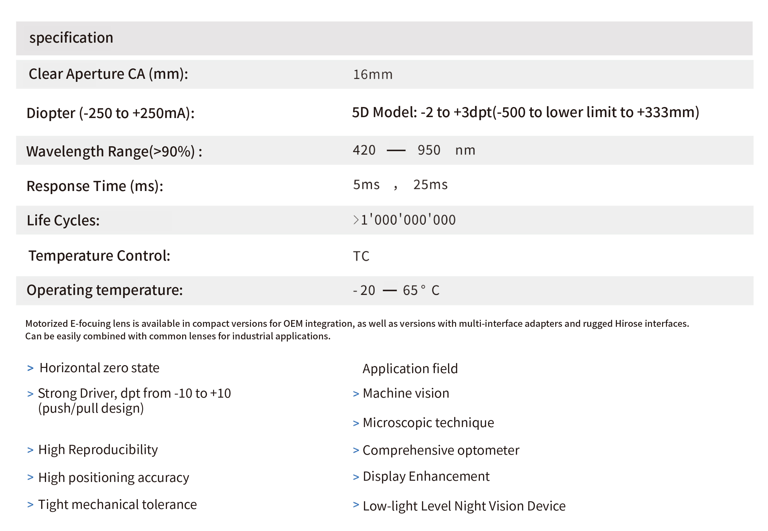 Focusing is completed within milliseconds. Billions of fast focusing adjustments. Diopter repeatability is stable within ±0.1dpt range. RS232 open protocol communication.